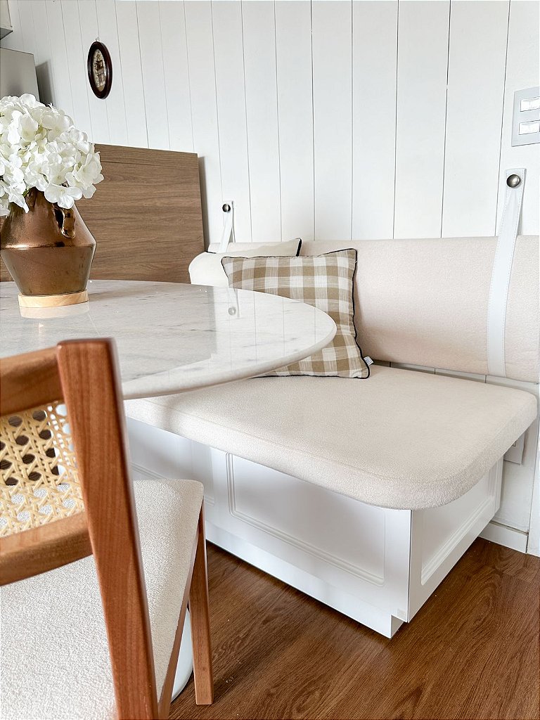 O Banco Provençal da Casa do Canto Alemão - banco no formato reto com 120cm de largura por 60cm de profundidade e altura do assento com 45cm, acompanha placa estofada de encosto que deve ser fixada à parede por alças em couro. Caixas em madeira branca laqueada (branco acetinado), com baú e gaveta em um dos lados da extremidade (após a compra você receberá uma ligação de nossa fábrica para definir o lado da gaveta) ou ligue para 11 2528-9000 e revise o seu pedido. Tecido em boucle cru.